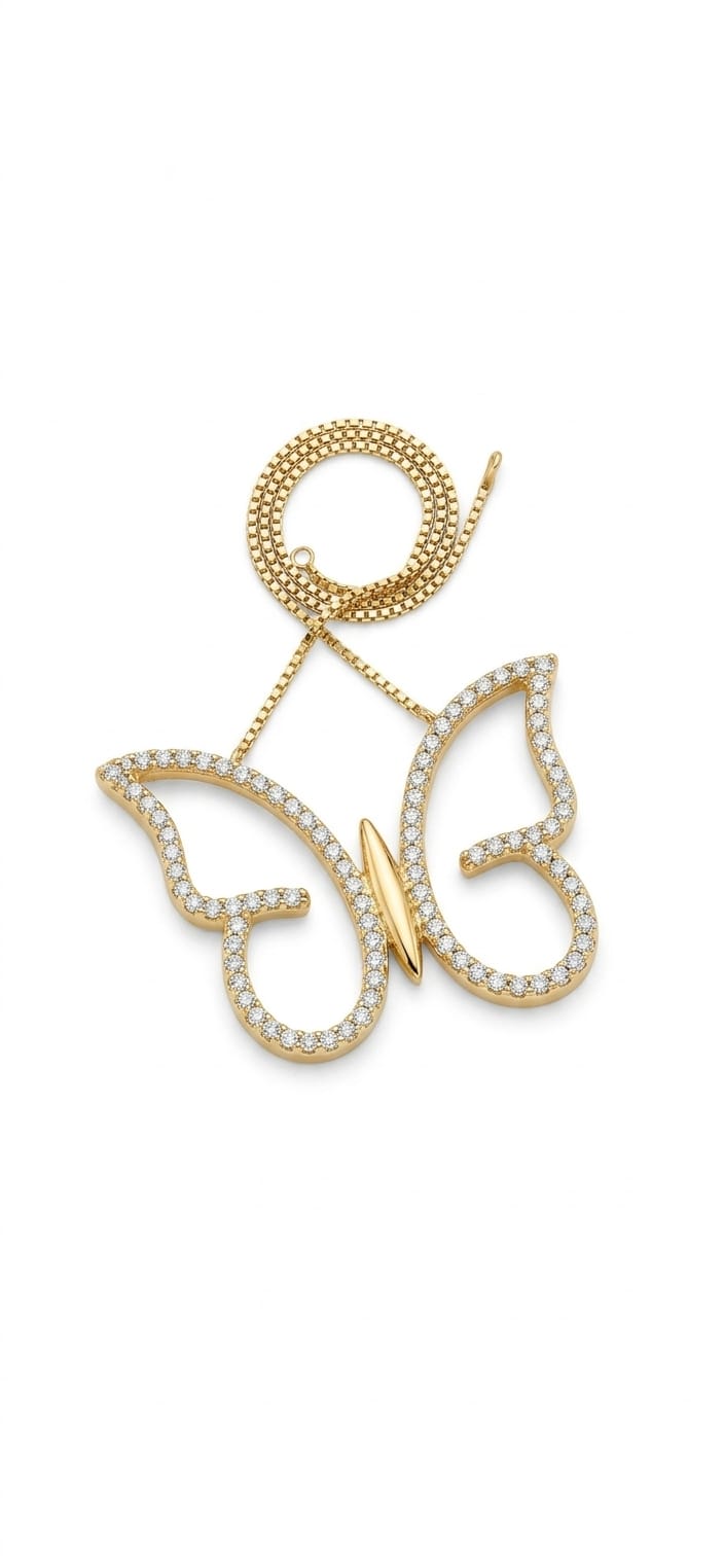 Colar borboleta vazada cravejada em zircônias, com pingente em tamanho mediano com aproximadamente 5 cm de altura e 4,5 cm de largura.