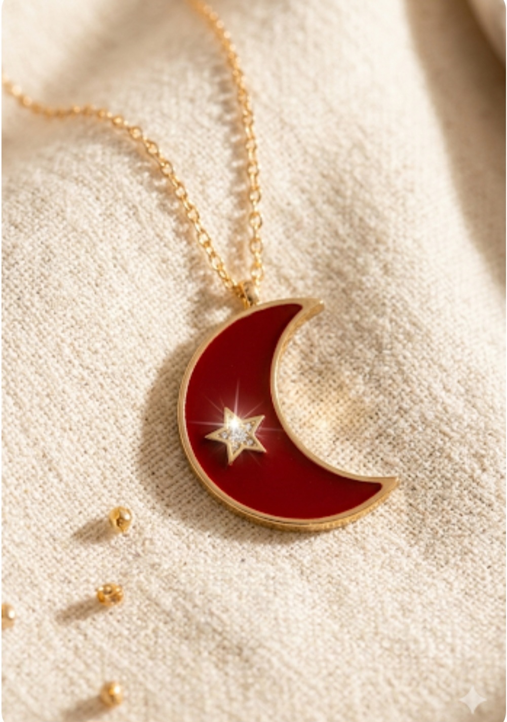 Colar com pingente em formato de meia lua esmaltada em cor vermelho bordô, com detalhe de estrela com uma cravação de zircônia.